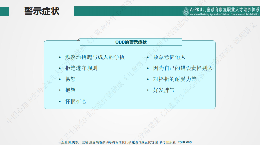 治疗:心理治疗是ODD 的常见治疗方法,家长/教师管理培训也是如此。如果问题相关,也可能会关注社交技能和解决问题的技能。此外,可以开具抗焦虑药物。
