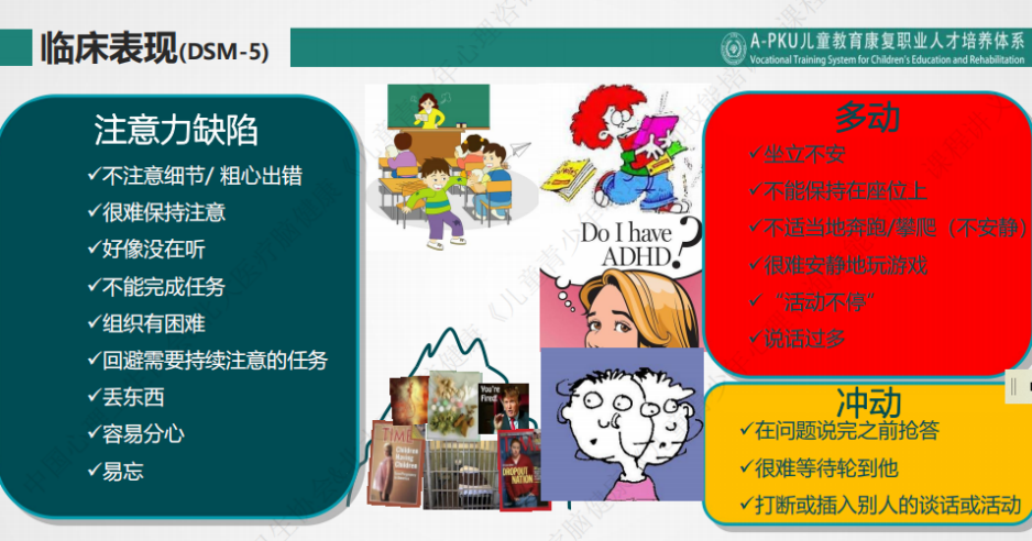 表现:过度说话;坐立不安;健忘; 结交或保持朋友的挑战;在重要时间(如学校)做白日梦;并且缺乏抗拒诱惑的能力。