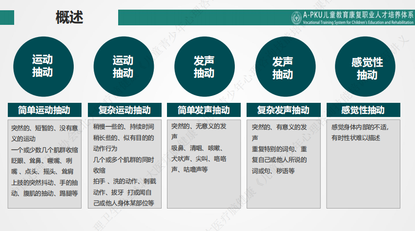 表现:运动可以包括眨眼或抽动眼睛;人声可以包括清嗓子、哼唱或大声喊出一个单词或短语而无法抑制它。