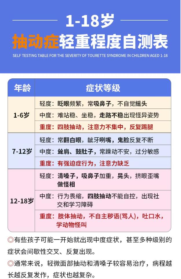 抽动症的症状严重程度可能随时间波动,并且症状的表现形式也可能会发生变化。症状通常在压力或疲劳时加重。此外,许多患者还可能伴有注意力缺陷、情绪问题或睡眠障碍。