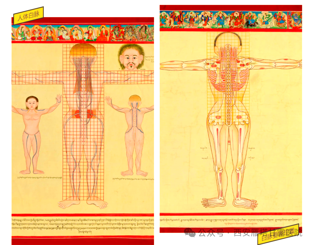 藏医认为人体的命脉主要由白脉(神经)和黑脉(血管)组成,把大脑比喻成白脉的海洋,把心脏比喻成黑脉的海洋,如图:这就是白脉的分布图,白脉与脏腑和四肢相连接,功能主要是管理运动知觉功能。黑脉包括红色命脉(动脉)和黑色命脉(静脉)。中风和中风后遗症在藏医中统称为黑白脉病。