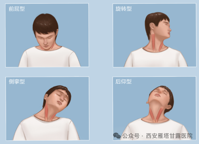 临床表现为颈部肌肉受到中枢神经异常放电导致不自主收缩,从而使头颈部痉挛性扭曲、歪斜和姿势异常,可伴有相应肌肉的痉挛性疼痛,通常可累及胸锁乳突肌、斜方肌、头夹肌和肩胛提肌等。