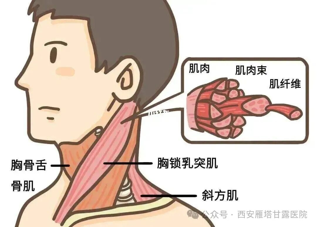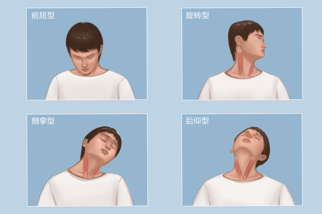 临床表现为颈部肌肉受到中枢神经异常放电导致不自主收缩,从而使头颈部痉挛性扭曲、歪斜和姿势异常,可伴有相应肌肉的痉挛性疼痛,通常可累及胸锁乳突肌、斜方肌、头夹肌和肩胛提肌等。