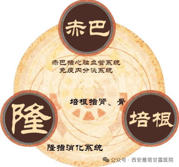隆、赤巴、培根三者,是存在于人体内的三大因素,为藏医学的理论基础。这三大因素支配着七大物质基础(饮食精微、血、肉、脂肪、骨、骨髓、精液)和三种排泄物(大便、小便、汗液)的运动变化。在一定条件下,隆、赤巴、培根保持相互协调,维持人体正常的生理活动。若其中之一偏盛或偏衰而失调,平衡破坏,就会产生疾病。