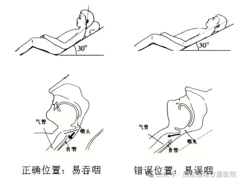 让患者坐直或床头摇高30°,头稍向前倾并偏向没生病的一侧。每次只喂1-2勺(约1-4ml),吃完一口多做几次空咽动作,再喂下一口。