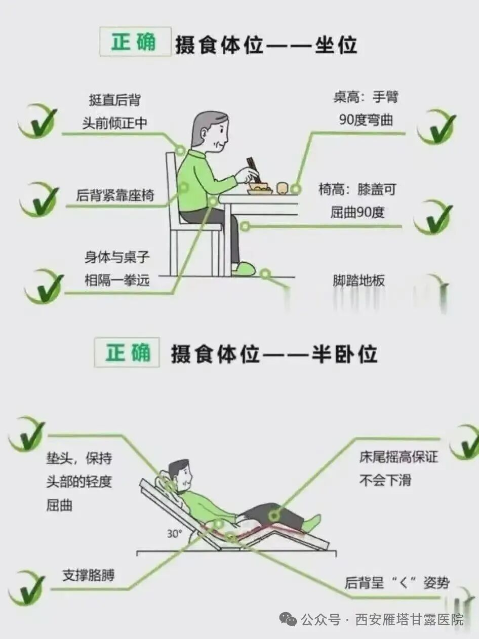 3. 经口进食患者要选择坐位或半卧位(30-45°),头部前屈;偏瘫者患侧肩部垫软枕,照顾者位于患者健侧,进食后让患者保持该体位30分钟;管饲营养过程中床头抬高30°。
